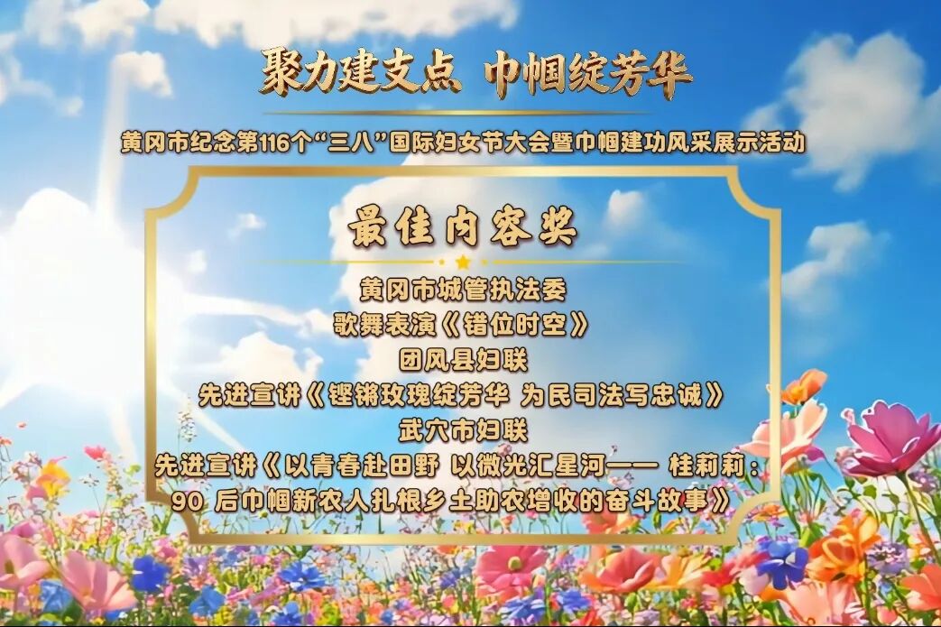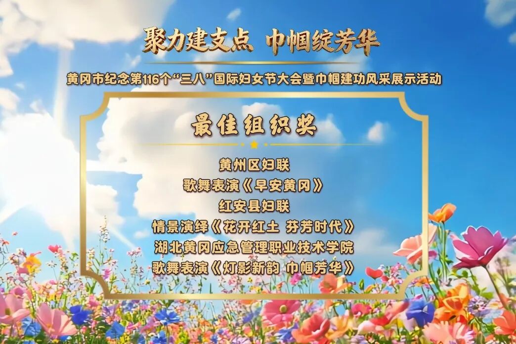 隨后,經(jīng)評委現(xiàn)場專業(yè)評審,活動評選出最佳創(chuàng)意獎、最佳內(nèi)容獎、最佳表現(xiàn)獎、最佳風(fēng)采獎、最佳組織獎五大獎項,以此致敬巾幗榜樣的辛勤付出與執(zhí)著堅守,傳遞對每一位女性的敬意與期許。本次盛會不僅是一場精彩紛呈的風(fēng)采展演,更是一次巾幗力量的集結(jié)與凝聚,向每一位立足崗位、奮勇爭先、不負韶華的黃岡女性致以崇高禮贊。