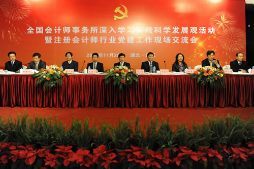 11月26日,財(cái)政部會(huì)計(jì)師事務(wù)所深入學(xué)習(xí)實(shí)踐科學(xué)發(fā)展觀活動(dòng)指導(dǎo)小組、中國(guó)注冊(cè)會(huì)計(jì)師行業(yè)黨委在湖北省武漢市召開(kāi)全國(guó)會(huì)計(jì)師事務(wù)所深入學(xué)習(xí)實(shí)踐科學(xué)發(fā)展觀活動(dòng)暨注冊(cè)會(huì)計(jì)師行業(yè)黨建工作現(xiàn)場(chǎng)交流會(huì),深入學(xué)習(xí)貫徹黨的十七屆四中全會(huì)精神,總結(jié)各省市區(qū)會(huì)計(jì)師事務(wù)所學(xué)習(xí)實(shí)踐活動(dòng)和行業(yè)黨建工作做法,交流經(jīng)驗(yàn),探討方法,凝聚共識(shí),更加扎實(shí)有效地推進(jìn)會(huì)計(jì)師事務(wù)所學(xué)習(xí)實(shí)踐活動(dòng)和行業(yè)黨建工作。財(cái)政部黨組成員、副部長(zhǎng)、財(cái)政部會(huì)計(jì)師事務(wù)所深入學(xué)習(xí)實(shí)踐科學(xué)發(fā)展觀活動(dòng)指導(dǎo)小組副組長(zhǎng)、中國(guó)注冊(cè)會(huì)計(jì)師行業(yè)黨委書(shū)記王軍,湖北省委常委、常務(wù)副省長(zhǎng)李憲生出席會(huì)議并講話。