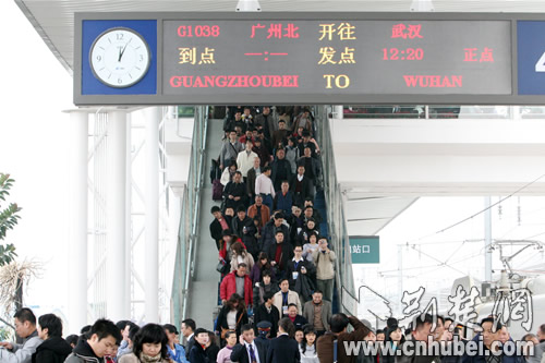 中午11時46分,列車?繌V州北站,歷時僅2小時46分鐘。在站臺上,記者遇到了一位帶著小孩的江西九江乘客,她興奮告訴記者,“我是慕名專程到武漢坐高鐵快車到廣州探親的,沒想到不到3個小時就到了,簡直不敢想!