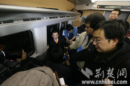 列車上,武漢鐵路局黨委書記張友松接受了記者采訪。他說,武廣高鐵充分展示了中國高速鐵路技術(shù)的最新成就,振奮了民族自信心。它的建成開通,充分證明了中國鐵路建設(shè),尤其是高速鐵路建設(shè)發(fā)展水平已處于世界領(lǐng)先水平。