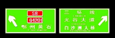 三環(huán)線由天興洲大橋往東新開發(fā)區(qū)光谷大道的一塊指路牌,左行指的是“關(guān)豹高速”,右行指的是“光谷大道”;但該路口左行是經(jīng)武黃高速去鄂州方向的,右行是經(jīng)三環(huán)線去白沙洲大橋方向的。路牌因信息不全、牌面又小,不少駕車人員到該路口時停車查看,不知行進方向。